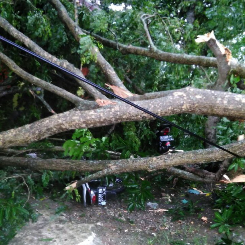 Bojonegoro (Ngasem) - Akibat hujan lebat disertai angin kencang yang terjadi di Desa Sendangharjo Kecamatan Ngasem Kabupaten Bojonegoro, pada Rabu (07/03/2018) pukul 14.30 WIB, mengakibatkan pohon Sono Belgi berdiameter kurang lebih 30 sentimeter, tumbang dan menimpa bagian depan rumah dinas Perhutani Soko serta satu unit sepeda motor juga mengalami kerusakan.