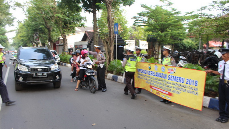 Bojonegoro Kota - Dihari ketiga pelaksanaan Operasi Keselamatan Semeru 2018, pada Rabu (07/03/2018) pagi, jajaran Sat Lantas Polres Bojonegoro laksanakan kampanye tata cara aman bersekolah di depan SDN Kadipaten yang berada di Jalan Teuku Umar Kota Bojonegoro dan bagikan brosur keselamatan, di pertigaan Pos Polisi Krempyeng, Jalan Gajah Mada Kota Bojonegoro.