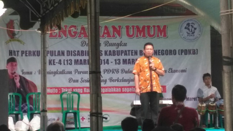 Bojonegoro - Perkumpulan Disabilitas Kabupaten Bojonegoro (PDKB) genap 4 tahun usianya, hari ini Rabu (07/03/2018). Mereka menggelar perayaan ulang tahun di halaman SDN 1 Ngemplak Kecamatan Kepohbaru. Perkumpulan disabilitas dari Tuban, Lamongan, Gresik juga hadir. Bupati Bojonegoro Suyoto juga hadir.