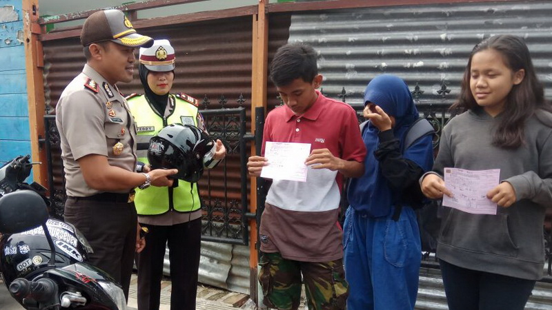 Terlihat raut wajah remaja yang belum memiliki SIM itu melakukan pelanggaran tidak memakai helm saat berkendara tertunduk malu dan takut. Petugas selain memberikan teguran juga memberikan tindakan surat tilang karena mereka berkendara tidak memperhatikan faktor keselamatan.