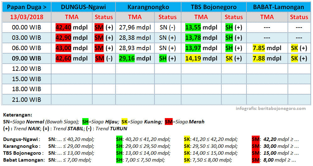 Sementara itu, berdasarkan data yang diterima media ini dari UPT Pengelola Sumber Daya Air (UPT PSDA) Wilayah Sungai Bengawan Solo di Bojonegoro, pada Selasa (13/03/2018) pukul 09.00 WIB, elevasi Tinggi Muka Air (TMA) Bengawan Solo pada papan duga TBS Bojonegoro Kota kembali masuk status siaga kuning, dengan trend naik.