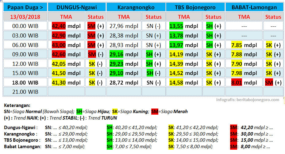 Bojonegoro Kota - Sebagaimana diberitakan sebelumnya, berdasarkan data yang diterima media ini dari UPT Pengelola Sumber Daya Air (UPT PSDA) Wilayah Sungai Bengawan Solo di Bojonegoro, pada Selasa (13/03/2018) pukul 09.00 WIB pagi tadi, elevasi Tinggi Muka Air (TMA) Bengawan Solo pada papan duga TBS Bojonegoro Kota, mulai masuk pada level siaga kuning. Hingga pukul 18.00 WIB petang ini, statusnya masih berada pada level siaga kuning, dengan tren masih terus mengalami kenaikan dan diperkirakan akan menyentuh pada level siaga merah.