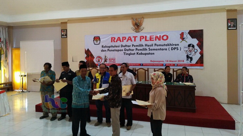 Bojonegoro - Komisi Pemilihan Umum (KPU) Kabupaten Bojonegoro, pada Rabu (14/03/2018), bertempat di Ruang Lantai II Gedung KPU Kabupaten Bojonegoro di Jalan KH R Rosyid No 93 Bojonegoro, menggelar Rapat Pleno, Rekapitulasi Daftar Pemilih hasil pemutakhiran yang akan ditetapkan menjadi Daftar Pemilih Sementara (DPS) tingkat Kabupaten.