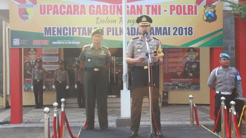Kapolres Bojonegoro, AKBP Wahyu S Bintoro SH SIK MSi, selaku Inspektur Upacara, yang didampingi oleh Kasdim 0813 Bojonegoro, dalam amanatnya menyampaikan bahwa Polri sebagai penanggungjawab keamanan dalam negeri, berkewajiban untuk mengawal, menjaga dan mengamankan penyelenggaraan Pemilukada serentak 2018, diantaranya melalui manajemen keamanan yang terpadu dan komprehensif, dengan mengerahkan segala sumber daya yang ada, serta memperkokoh kerja sama dengan Penyelenggara Pemilu, TNI, masyarakat dan mitra keamanan lainnya.