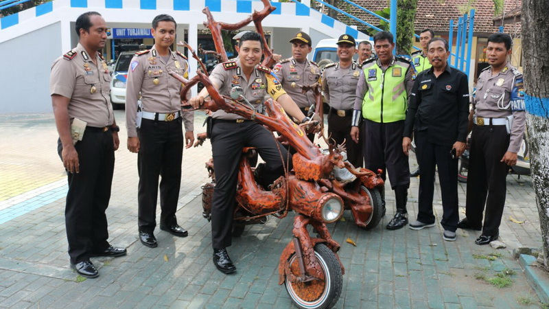 Bojonegoro Kota - Ada yang menarik, disaat Kapolres Bojonegoro mengecek barang bukti kendaraan bermotor hasil razia Operasi Keselamatan Semeru 2018, pada Rabu (21/03/2018) lalu, di Mako Sat Lantas Polres Bojonegoro. Diantara sepeda motor yang dijadikan sebagai barang bukti, ada satu motor yang bisa dikatakan unik dan nyeleneh. Motor bermesin Vespa tersebut dimodifikasi menggunakan rangka kayu menggunakan 4 roda, hingga bentuk aslinya tidak tampak lagi.