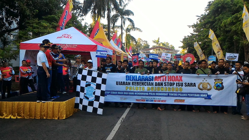 Bojonegoro Kota - Polres Bojonegoro bersama sejumlah komunitas dan warga masyarakat Bojonegoro, pada Minggu (25/03/2018) pagi, bertempat di area Car Free Day (CFD) Alun-alun Kota Bojonegoro, menggelar Deklarasi Anti Hoax, Ujaran Kebencian dan Stop Isu Sara.