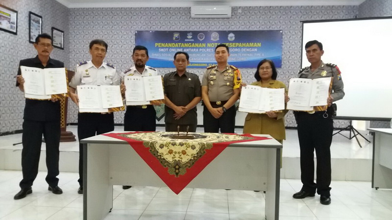 Bojonegoro - Polres Bojonegoro pada Selasa (03/04/2018) sekira pukul 09.00 WIB, bertempat di Aula Parama Satwika Mapolres Bojonegoro, menggelar penandatanganan nota kesepahaman (MoU) Surat Keterangan Orang Terlantar (SKOT) Online dengan Dinas Sosial Bojonegoro, Dinas Perhubungan Bojonegoro, Satuan Pelayanan Terminal Tipe A Rajekwesi Bojonegoro dan DPC Organda Kabupaten Bojonegoro