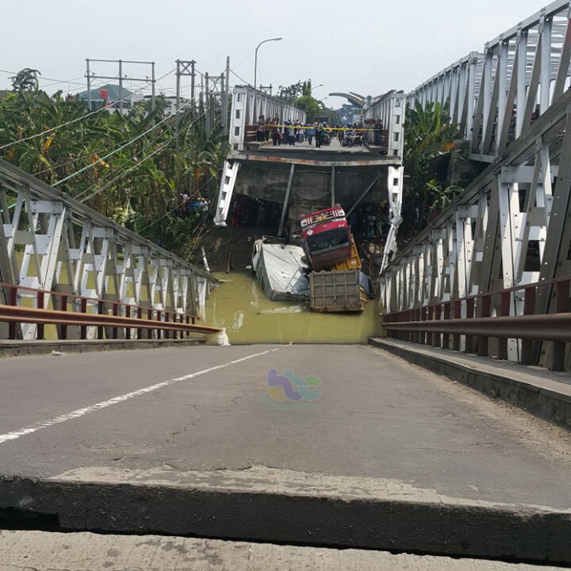Tuban / Lamongan - Jembatan Babat Lamongan -Widang Tuban, yang melintas di atas sungai Bengawan Solo, pada Selasa (17/04/2018) sekira pukul 10. 50 WIB, ambrol. Tiga truk tronton yang sedang melintas di atas jembatan tersebut, turut terjatuh di dasar sungai. Untuk sementara, satu orang sopir dilaporkan meninggal dunia.