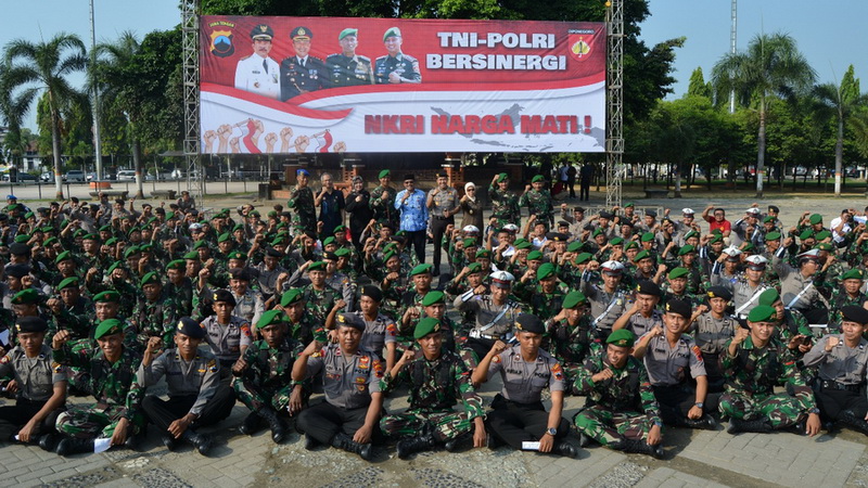 Blora - Ratusan anggota TNI dan Polri pada Selasa (17/04/2018) pagi, ikuti Apel Sinergitas TNI-Polri, di Alun-alun depan Pendapa Kabupaten Blora. Kegiatan tersebut dalam rangka menjaga situasi kamtibmas menjelang pemilihan kepala daerah di provinsi Jawa Tengah, yang tinggal dua bulan lagi.