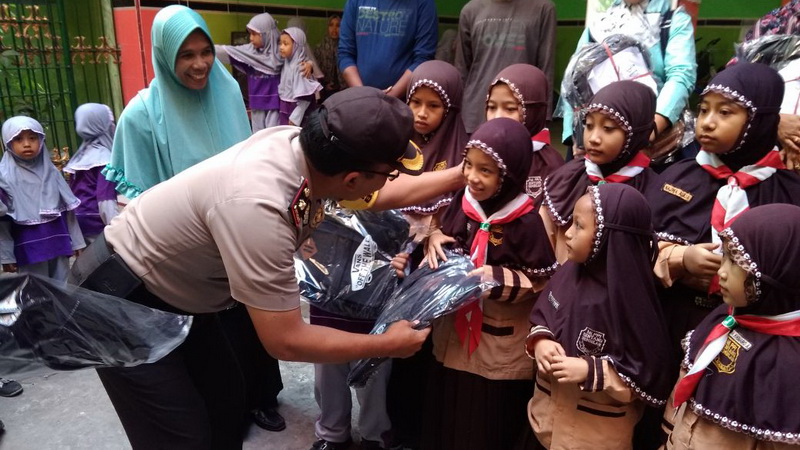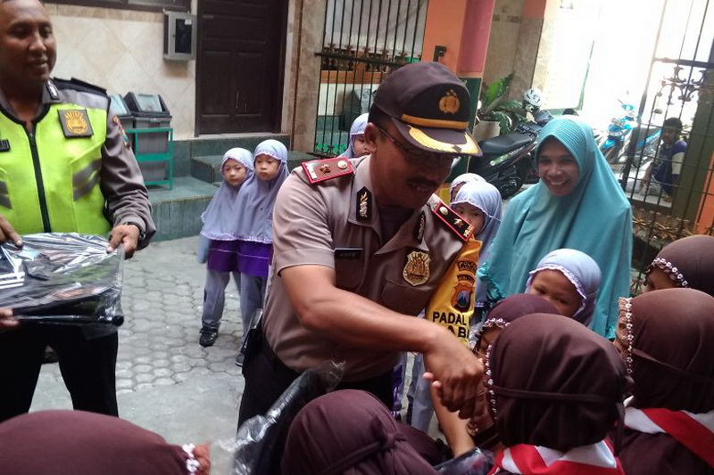 Lamongan (Babat) - Kapolsek Babat, Kompol Hariadi Agus Wahono SH, bersama warga yang tergabung dalam komunitas Berbagi Dengan Ikhlas (Berkas), pada Jumat (27/04/2108) membagikan tas sekolah pada siswa-siswi yatim-piatu dan kurang mampu, di 19 lembaga pendidikan setingkat sekolah dasar (SD) dan madrasah ibtidaiyah (MI), di wilayah Kecamatan Babat Kabupaten Lamongan.