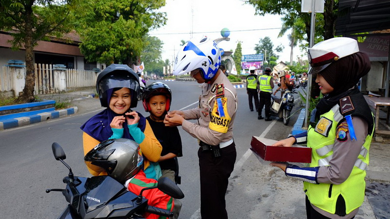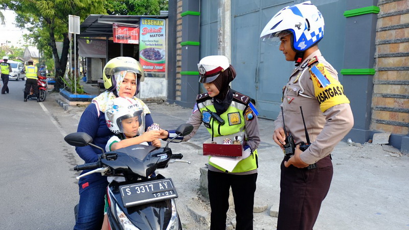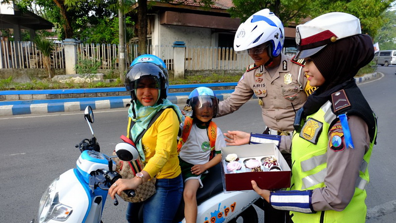 Bojonegoro Kota - Ada yang berbeda dalam pelaksanaan Operasi Patuh Semeru 2018 hari kesepuluh Sabtu (05/05/2018) hari ini. jajaran Sat Lantas Polres Bojonegoro selain memberikan tindakan kepada pengendara kendaraan yang melakukan pelanggaran, anggota juga memberikan apresiasi dengan memberikan hadiah berupa cup cakes, kepada pengendara kendaraan roda dua yang telihat membocengkan anaknya dan dilengkapi dengan menggunakan helm berstandar SNI sebagai alat keselamatan diri.