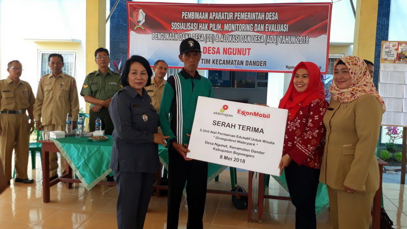 Bojonegoro (Dander) - Kontraktor Kontrak Kerja sama Blok Cepu, ExxonMobil Cepu Limited (EMCL) memberikan bantuan berula alat permainan, guna pengembangan wisata Growgoland Waterpark di Desa Ngunut Kecamatan Dander Kabupaten Bojonegoro, pada Selasa (08/05/2018). Bantuan diserahkan di balai desa setempat kepada Camat Nanik Lusetiyani.