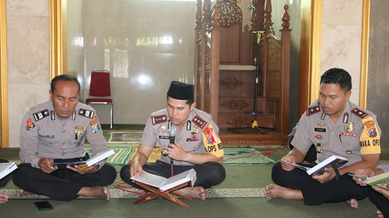 Bojonegoro - Nuansa Ramadhan benar benar terasa di Polres Bojonegoro, dihari pertama puasa ramadan pada Kamis (17/05/2018) sehabis shalat dhuhur siang tadi, di area Mapolres Bojonegoro, terdengar alunan tadarus Al-Quran yang dilantunkan oleh anggota Polres Bojonegoro. Rencananya setiap hari minimal diselesaikan satu juz atau dengan istilah “One Day One Juz”.