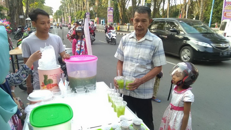 BojonegoroKota- Para pemuda dan pemudi yang tergabung dalam Komunitas Kelas Inspirasi Bojonegoro (KIB) terlihat sibuk menawarkan takjil, ke sejumlah masyarakat yang lewat dan berjalan-jalan sekitar Masjid Darussalam dan Alun-alun Kota Bojonegoro, Rabu, (30/05/2018) sore. Kegiatan tersebut sebagai upaya penggalangan dana yang diperuntukkan bagi anak-anak yatim.