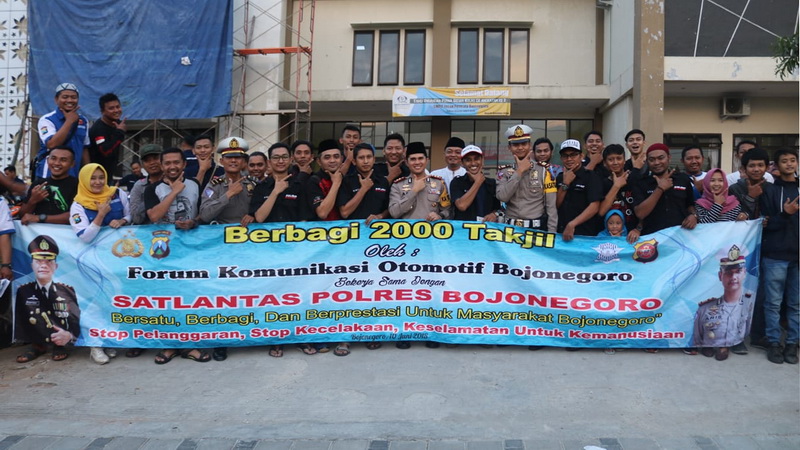 Bojonegoro - Sat Lantas Polres Bojonegoro dengan menggandeng Forum Komunikasi Otomotif Bojonegoro (FKOB) pada Minggu (10/06/2018) sore tadi, bagikan lebih dari 2000 takjil kepada masyarakat Bojonegoro yang sedang melintas di Jalan Veteran Bojonegoro Kota.