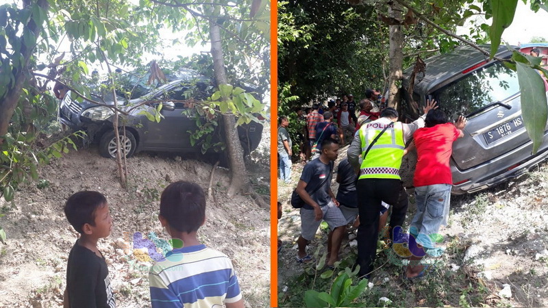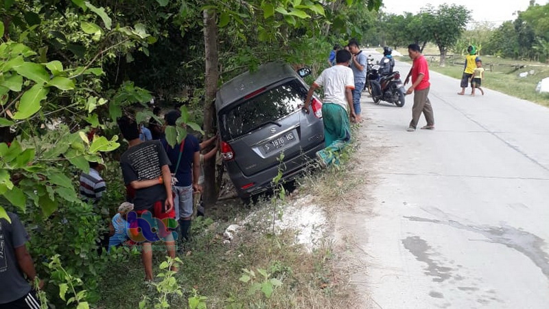 Hindari Sepeda Pancal, Mobil Ertiga di Sukosewu Bojonegoro Terperosok di Bahu Jalan