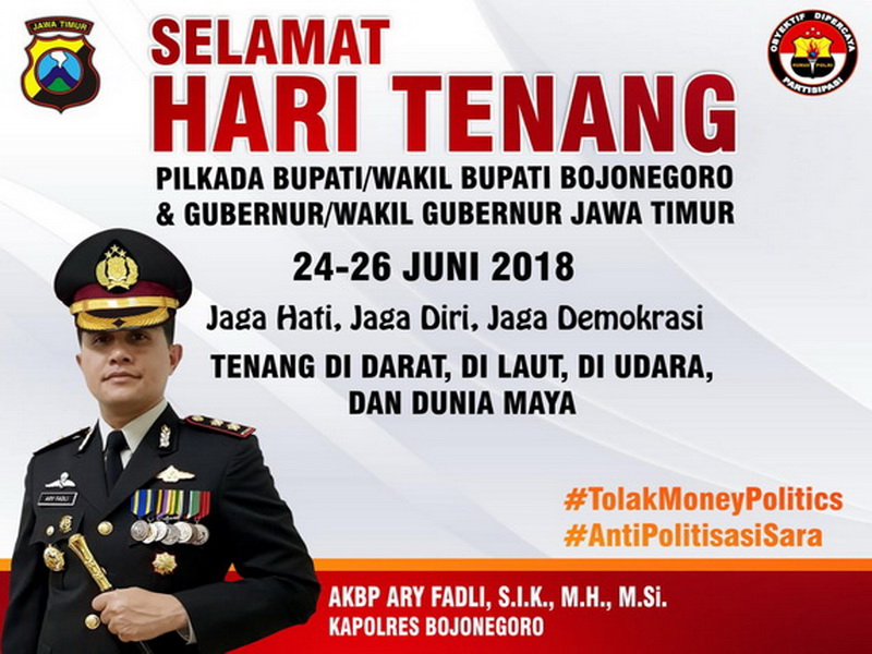 Bojonegoro - Selama masa tenang dan jelang pelaksanaan pencoblosan pilkada serentak 2018, Kapolres Bojonegoro, AKBP Ary Fadli SIK MH MSi, pada Senin (25/06/2018) pagi, mengimbau kepada seluruh pendukung pasangan calon, baik calon Bupati dan Wakil Bupati Bojonegoro serta calon Gubernur dan Wakil Gubernur Jatim, untuk tidak saling ejek dan saling menjatuhkan termasuk juga kemungkinan adanya ujaran kebencian dan atau pencemaran nama baik, terhadap pasangan calon lain, melalui media sosial.