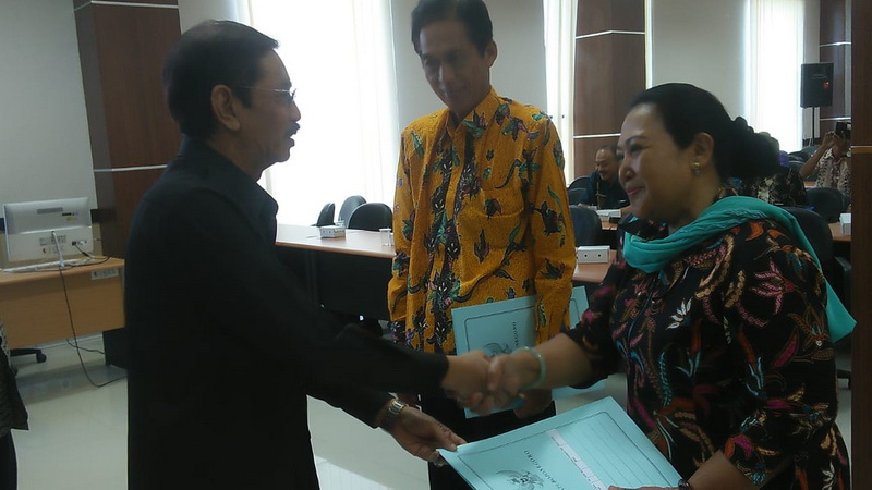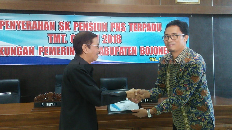 Penyerahan SK Pensiun di laksanakan oleh Penjabat Bupati Bojonegoro Dr Suprianto SH MH, di dampingi oleh Kepala Badan Kepegawaian Pendidikan dan Pelatihan (BKPP) Pemkab Bojonegoro, Drs Zainuddin MM dan Wakil Kepala Cabang Utama PT Taspen Surabaya, Tamsir.