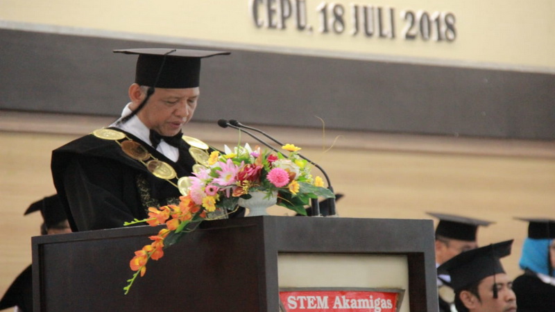 Blora - Bupati Blora Djoko Nugroho menghadiri wisuda Sarjana Terapan ke 47 Sekolah Tinggi Energi dan Mineral (STEM) Politeknik Energi dan Mineral (PEM) Akamigas Cepu, tahun akademik 2017/2018 di Gedung Graha Okta Cepu. Dari 183 sarjana yang diwisuda, ada 1 orang yang meninggal dunia saat mau terbang ke Cepu, sehingga batal diwisuda.