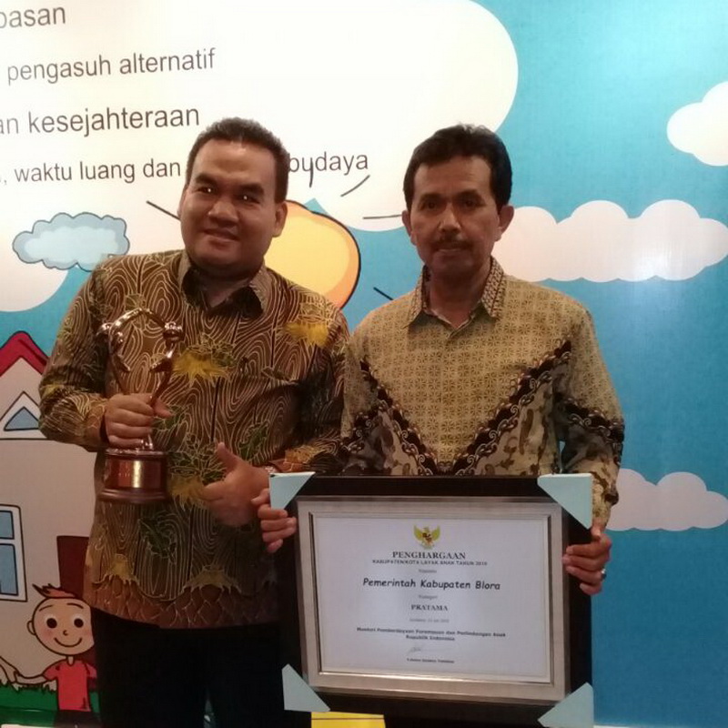 Blora - Pemerintah Kabupaten Blora meraih penghargaan dari Kementerian Pemberdayaan Perempuan dan Perlindungan Anak (Kemen PPPA) sebagai Kabupaten Layak Anak “Pratama” 2018. Penghargaan diserahkan langsung oleh Menteri PPPA Yohana Susana Yembise kepada Wakil Bupati Blora H.Arief Rohman M.Si dalam acara peringatan Hari Anak Nasional 2018 di Surabaya, Senin malam (23/7/2018).