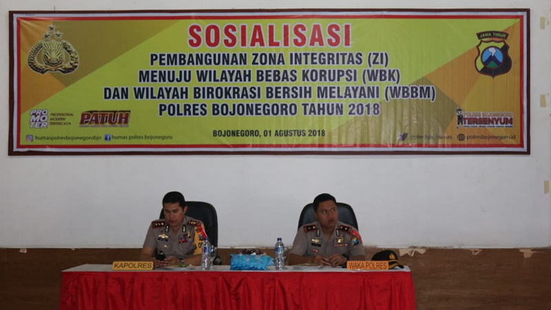 Bojonegoro - Polres Bojonegoro pada Rabu (01/08/2018) siang, bertempat di Gedung Mliwis Putih Sat Lantas Polres Bojonegoro, laksanakan kegiatan Sosialisasi Pembangunan Zona Integritas, Menuju Wilayah Bebas Korupsi dan Wilayah Birokrasi Bersih Melayani.