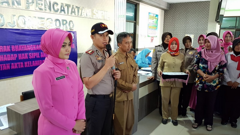 Bojonegoro - Dalam rangka memperingati Hari Kesatuan Gerak Bhayangkari (HKGB) ke 66 tahun 2018, Pengurus Bhayangkari Cabang Bojonegoro bekerjasama dengan Dinas Kependudukan dan Pencatatan Sipil (Disdukcapil) Kabupaten Bojonegoro, pada Senin (06/08/2018) pagi tadi, bertempat di kantor Disdukcapil Kabupaten Bojonegoro membagikan 100 akta kelahiran kepada orang tua anak,