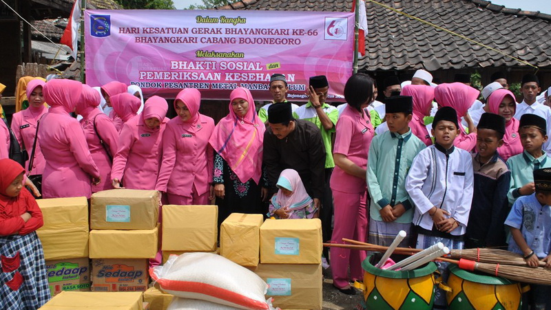 Bojonegoro - Dalam rangka memperingati Hari Kesatuan Gerak Bhayangkari (HKGB) ke 66 tahun 2018, Bhayangkari Cabang Bojonegoro, pada Rabu (08/08/2018) siang, laksanakan kegiatan bakti sosial ke Pondok Pesantren (Ponpes) Manba'ul Ulum, Pimpinan KH. Achmad Mahsun, di Desa Bulu Kecamatan Sugihwaras Kabupaten Bojonegoro.