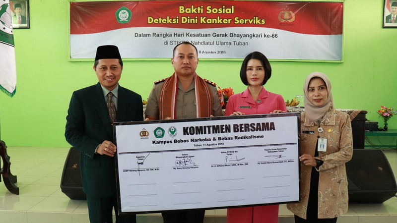Tuban - Dalam rangka Hari Kesatuan Gerak Bhayangkari (HKGB) ke 66 tahun 2018, Bhayangkari Cabang Tuban bekerja sama dengan STIKE NU Tuban, pada Sabtu (11/08/2018) pagi, menggelar Bakti Sosial Deteksi Dini Kanker Serviks, berupa tes IVA atau deteksi dini kanker leher rahim (serviks) dan Sadanis atau pemeriksaan payudara dengan tenaga medis.