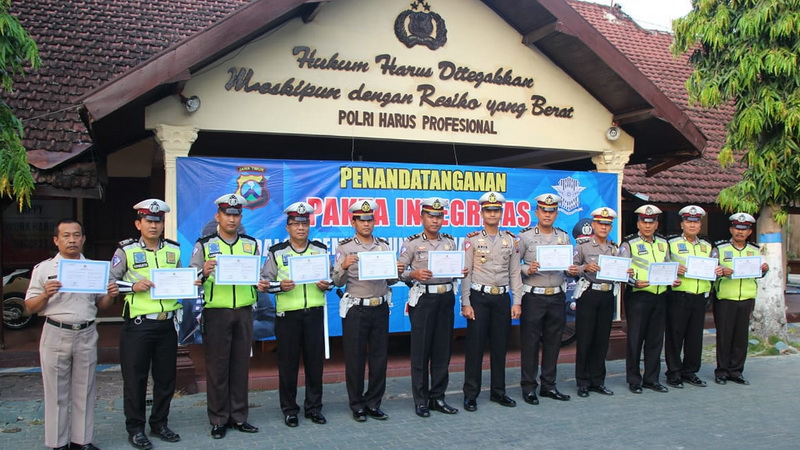 Bojonegoro - Guna mendukung pembangunan Zona Integritas (ZI) menuju Wilayah Bebas Korupsi (WBK) dan Wilayah Birokrasi Bersih dan Melayani (WBBM), di jajaran Polres Bojonegoro, seluruh anggota Satuan Lalu Lintas (Sat Lantas) Polres Bojonegoro, pada Senin (13/08/2018) di halaman Sat Lantas Polres Bojonegoro, laksanakan penandatanganan pakta integritas. Penadatanganan pakta integritas tersebut dipimpin langsung oleh Kasat Lantas Polres Bojonegoro, AKP Aristianti BS SIK SH MH.