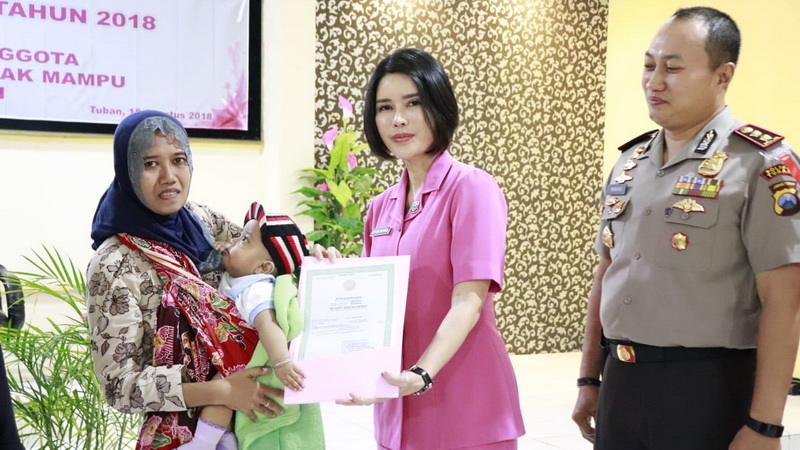 Penyerahan akta kelahiran tersebut dilaksanakan langsung oleh Ketua Bhayangkari Cabang Tuban, Ny Nany Nanang Haryono, yang dihadiri Kapolres Tuban AKBP Nanang Haryono SH SIK MSi, Wakapolres Tuban Kompol Teguh Priyo Wasono SIK, Kepala Dinas Kependudukan dan Catatan Sipil Kabupaten Tuban, Drs Agus Supriyono Hadi MM besama staf, pejabat utama Polres Tuban dan pengurus serta anggota Bhayangkari Cabang Tuban.