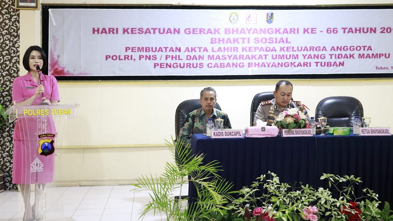 Ketua Bhayangkari Cabang Tuban, Ny Nany Nanang Haryono, dalam sambutannya mengatakan bahwa bakti sosial tersebut merupakan rangkaian kegiatan HKGB ke 66, dimana sesuai instruksi ketua umum, seluruh Bhayangkari untuk melakukan kegiatan sosial, salah satunya melalui pembuatan akta kelahiran, dengan sasaran anggota Polri, PNS dan PHL jajaran Polres Tuban serta bagi masyarakat umum yang kurang mampu.
