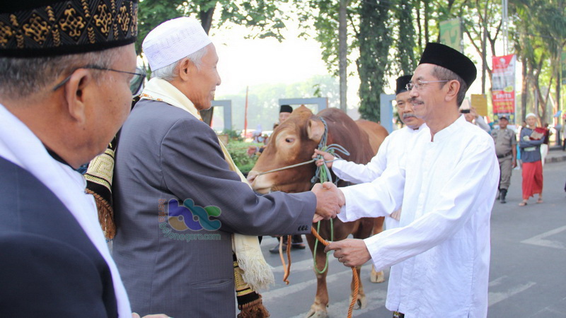 Usai melakukan salat Iduladha Pj Bupati Bojonegoro menyerahkan hewan kurban berupa sapi kepada panitia kurban Masjid Agung Darussalam.