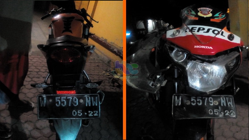 Dari identifikasi petugas, identitas kendaraan yang terlibat laka-lantas tersebut sepeda motor Honda CBR Repsol nomor polisi W 5579 NW yang dikendarai Adi Dwi Setiawan (16), berboncengan dengan Ahmad Mujib (16) keduanya warga Dusun Klitik Desa Sugihwaras Kecamatan Sugihwaras Kabupaten Bojonegoro.