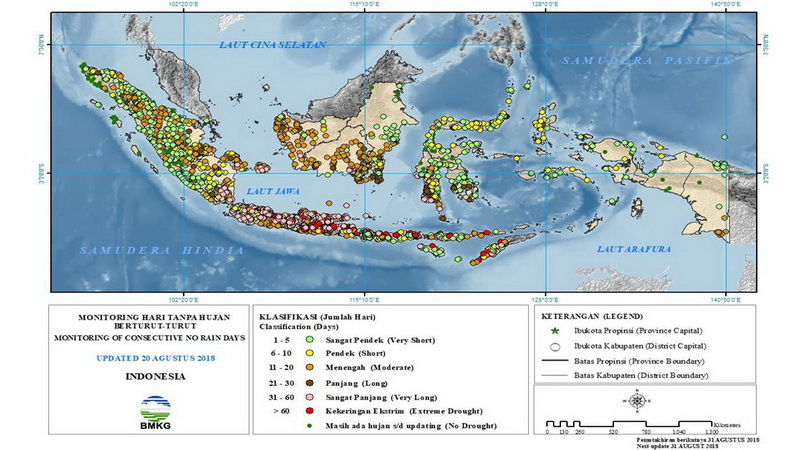 Sementara itu, Deputi Bidang Klimatologi BMKG, Herizal menerangkan hasil monitoring yang dilakukan BMKG menunjukkan hingga pertengahan Agustus 2018 hampir seluruh wilayah Indonesia telah memasuki musim kemarau yaitu sebanyak 95.03 persen. Sedangkan sisanya 4.97 persen masih mengalami musim hujan. Adapun musim kemarau diprediksikan akan berlangsung hingga akhir Oktober 2018.