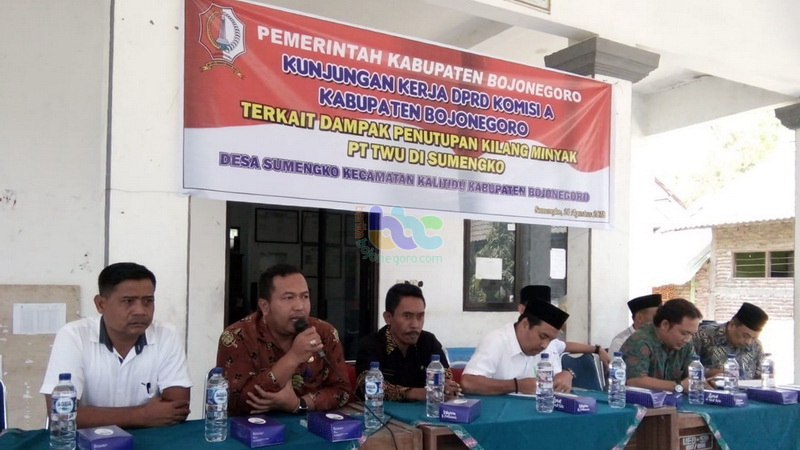 Bojonegoro (Kalitidu) - Komisi A DPRD Kabupaten Bojonegoro, pada Jumat (24/08/2018) pagi, laksanakan kunjungan lapangan ke Balai Desa Sumengko Kecamatan Kalitidu Kabupaten Bojonegoro, terkait dampak dari tutupnya mini refinery atau kilang skala kecil (mini) milik PT Tri Wahana Universal (TWU) yang berada di Desa Sumengko Kecamatan Kalitidu Kabupaten Bojonegoro.