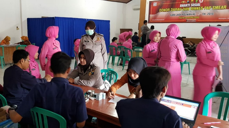 Bojonegoro - Dalam Rangka memperingati HUT Polwan ke 70 tahun 2018, Polwan Polres Bojonegoro pada Rabu (29/08/2018) bertempat di Aula Mliwis Putih Mako Sat Lantas Polres Bojonegoro, menggelar acara bakti sosial diantaranya donor darah, pemeriksaan kesehatan (rikkes) pap smear dan vaksinasi difteri kepada wanita yang ada di lingkungan Polres Bojonegoro.