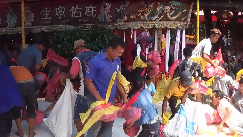 Sejak pagi ratusan warga sekitar klenteng dan jamaat yang datang tersebut rela menunggu berjam-jam di halaman klenteng untuk berebut nasi buceng dan sembako yang telah di siapkan oleh pegurus klenteng.