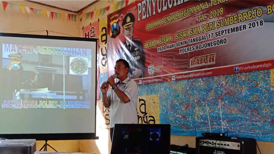 Bojonegoro - Satuan Reserse Narkoba (Sat Reskoba) Polres Bojonegoro, pada Senin (17/09/2018) pagi tadi, kembali laksanakan pembinaan dan penyuluhan (binluh) tentang bahaya penyalahgunaan dan peredaran gelap narkoba kepada para pelajar di SMA PGRI Sumberrejo.