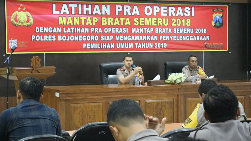 Bojonegoro - Dalam rangka persiapan pengamanan Pemilihan Umum Legislatif (Pileg) dan pemilihan Presiden dan Wakil Presiden (Pilpres) tahun 2019 serta dalam rangka pelaksanaan Operasi Mantap Brata Semeru 2018, pada Kamis (20/09/2018), bertempat di Partnership Room Lantai 4 Gedung Pemkab Bojonegoro, Kapolres Bojonegoro AKBP Ary Fadli SIK MH MSi, membuka Latihan Pra Operasi Mantap Brata Semeru 2018.