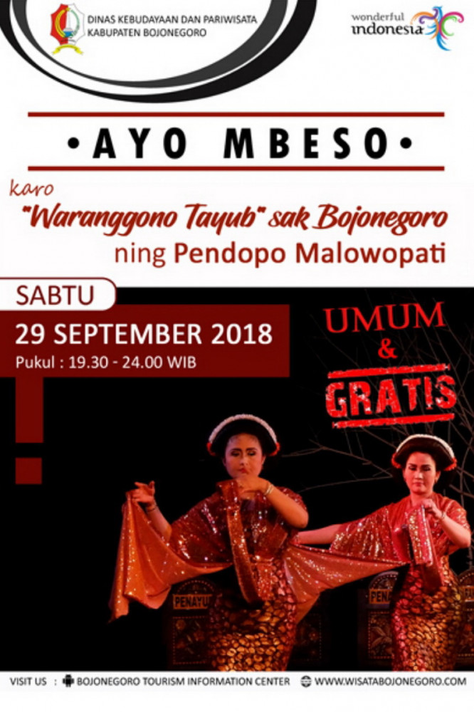 Untuk itu, melalui media ini pihakna mengajak selueurh warga Bojonegoro dan sekitarnya untuk datang beramai-ramai mbeso karo waranggono tayub sak Bojonegoro, pada hari Sabtu, 29 September 2018 di Pendapa Malowopati Bojonegoro.