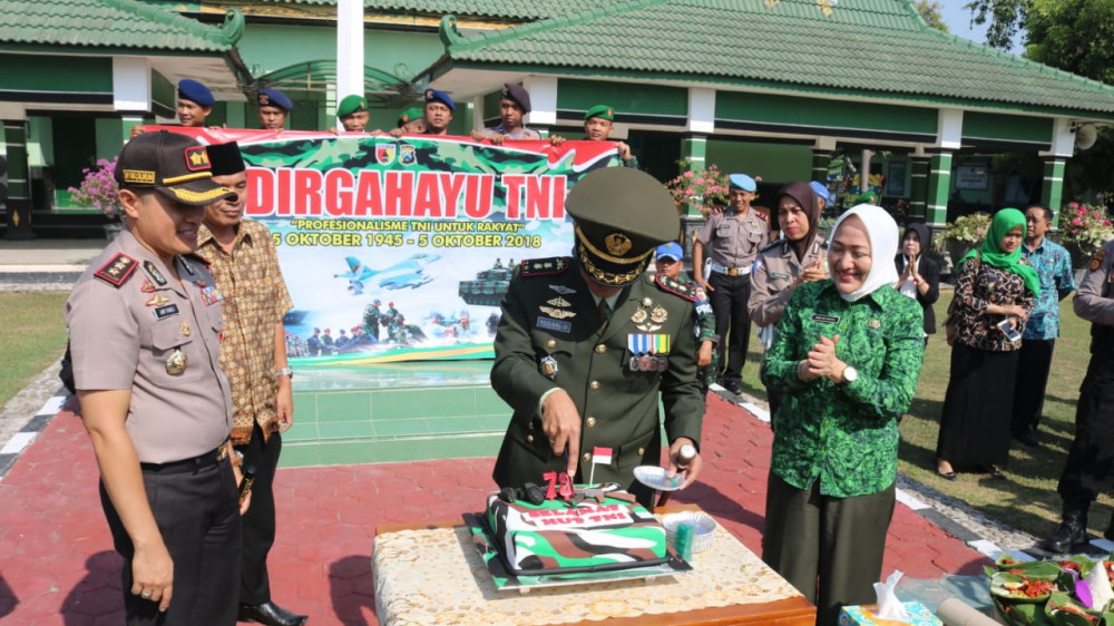 Bojonegoro - Saat peringatan Hari Ulang Tahun ke 73 Tentara Nasional Indonesia (TNI), Kapolres Bojonegoro bersama Forpimda Kabupaten Bojonegoro, pada hari Jum'at (05/10/2018) pagi tadi, datang ke Kodim 0813 Bojonegoro untuk memberikan kejutan, berupa sebuah kue ulang tahun.