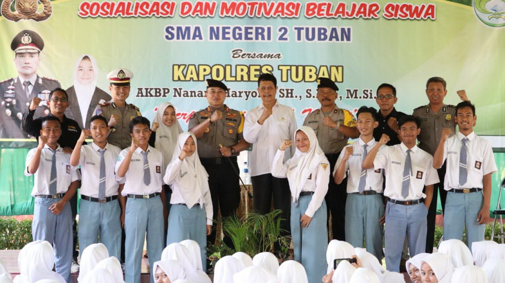 Tuban - Dalam rangka memerangi informasi hoax dan untuk menekan peredaran dan penyalahgunaan narkoba di kalangan pelajar, Kapolres Tuban, AKBP Nanang Haryono SH SIK MSi, pada Rabu (10/10/2018), memberikan edukasi serta motivasi kepada seluruh pelajar Sekolah Menengah Atas Negeri (SMAN) 2 Tuban,