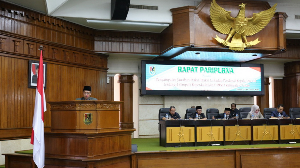 Tuban - Rapat Paripurna tentang Penyampaian Jawaban Fraksi terhadap Pendapat Kepala Daerah tentang 4 Raperda Inisiatif DRPD Kabupaten Tuban dilaksanakan di ruang Rapat Paripurna Dewan Perwakilan Rakyat Daerah (DPRD) Tuban, Senin (15/10/2018).