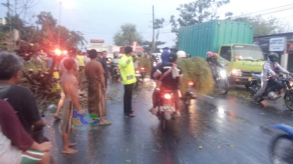 Bojonegoro (Kalitidu) - Akibat hujan lebat disertai angin kencang yang terjadi pada Senin (15/10/2018) sekira pukul 16.30 WIB sore tadi, mengakibatkan pohon penghijauan yang berada di Jalur jalam raya Bojonegoro - Cepu, tepatnya di jalan raya turut Desa Mayangrejo Kecamatan Kalitidu Kabupaten Bojonegoro tumbang dan melintang di jalan raya. Kejadian tersebut sempat membuat arus lalu-lintas di jalur tersebut tersedat.