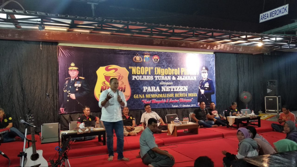 Tuban - Untuk menjalin tali silaturrahmi dengan Nitizen Kabupaten Tuban, Polres Tuban menggelar Ngobrol Pintar (Ngopi) dengan tema "Guna Meminimalisir Berita Hoax" yang digelar di halaman Mapolres Tuban, Rabu (17/10/2018) mulai pukul 20.00 WIB.