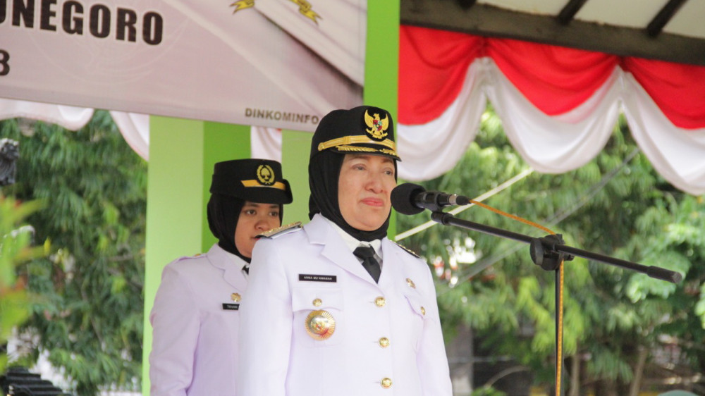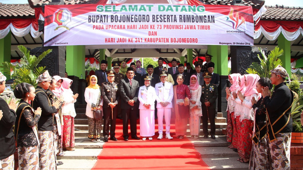 Bojonegoro - Bupati Bojonegoro DR Hj Anna Mu’awanah, pada Sabtu (20/’10/2018) pagi, bertempat di Alun-alun Kota Bojonegoro, memimpin Apel atau Upacara peringatan Hari Jadi ke 341 Kabupaten Bojonegoro dan Hari Jadi ke 73 Provinsi Jawa Timur.