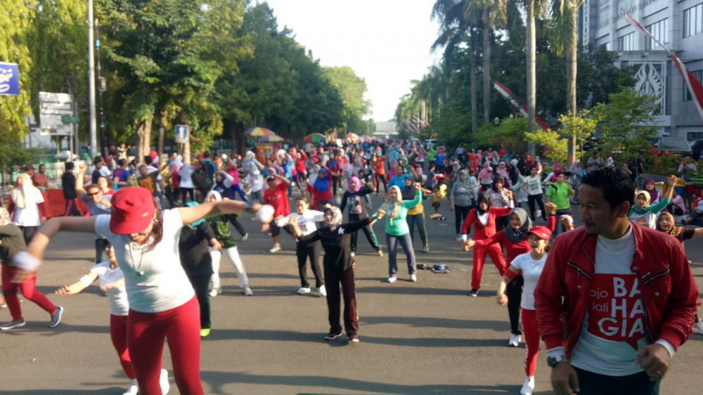 Bojonegoro - Ribuan warga masyarakat yang berada di area Car Free Day (CFD) di seputaran Alun-alun Bojonegoro, tepatnya di sepanjang Jalan Mas Tumapel Bojonegoro, pada Minggu (21/10/2018) pagi dengan antusias mengikuti Senam Dayung.