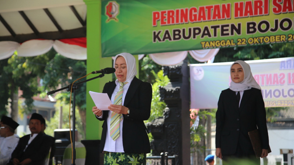 Bojonegoro - Bupati Bojonegoro Dr Hj Anna Muawanah, pada Senin (22/10/2018) pagi, bertempat di Alun-alun Bojonegoro memiimpin upacara peringatan Hari Santri Nasional ke-4, tahun 20188. Hari Santri Nasional tahu ini mengambil tema “Bersama Santri Damailah Negeri”.