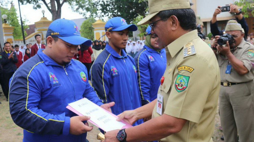 Blora - Para atlet Kabupaten Blora yang berhasil meraih medali dalam ajang pekan Olah Raga Provinsi (Porprov) Jawa Tengah 2018 di Surakarta pekan lalu, kini menerima bonus dari Pemerintah Kabupaten Blora. Bonus diserahkan langsung oleh Bupati Blora, Djoko Nugroho di halaman Setda Blora.