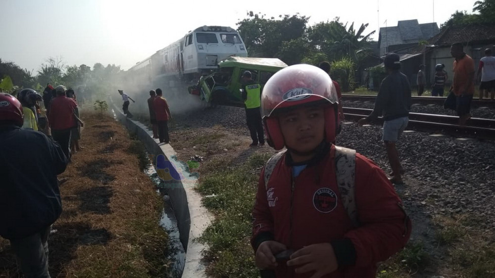 Mobil penumpang umum (MPU) warna hijau yang mogok di perlitasan kereta api, ditabrak Kereta Api Maharani yang berjalan dari arah Surabaya menuju Semarang.
